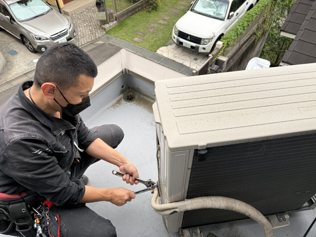 室外機が壁面の専用のカゴに収められているもので、はしごを使う作業になる場合は、別途で高所作業もかかる可能性があります。