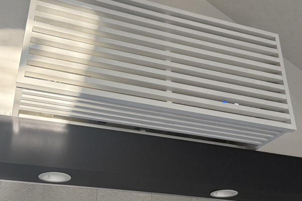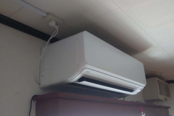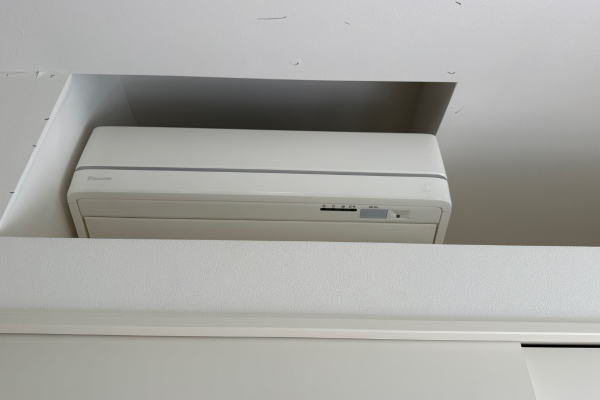 室外機が床ではなく天井に天吊り架台で設置してあるもの。マンション、アパート、や団地などの集合住宅がこの施工が多いです。